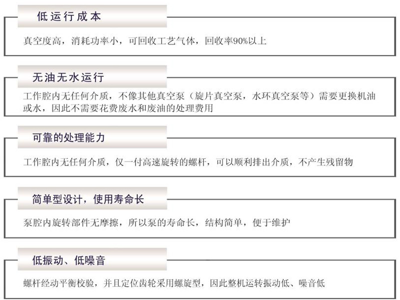 螺桿泵工作腔為間隙密封,無(wú)潤(rùn)滑油,是環(huán)保型真空設(shè)備,因此干式螺桿泵能抽除含有大量水蒸汽及少量粉塵的氣體,極限真空高,消耗功率低,具有節(jié)能、降耗免維修等優(yōu)點(diǎn),特別在半導(dǎo)體、電子工業(yè)中要求無(wú)油潔凈的場(chǎng)合以及化工制藥中對(duì)溶劑的回收工藝等具有不可比擬的優(yōu)越性。